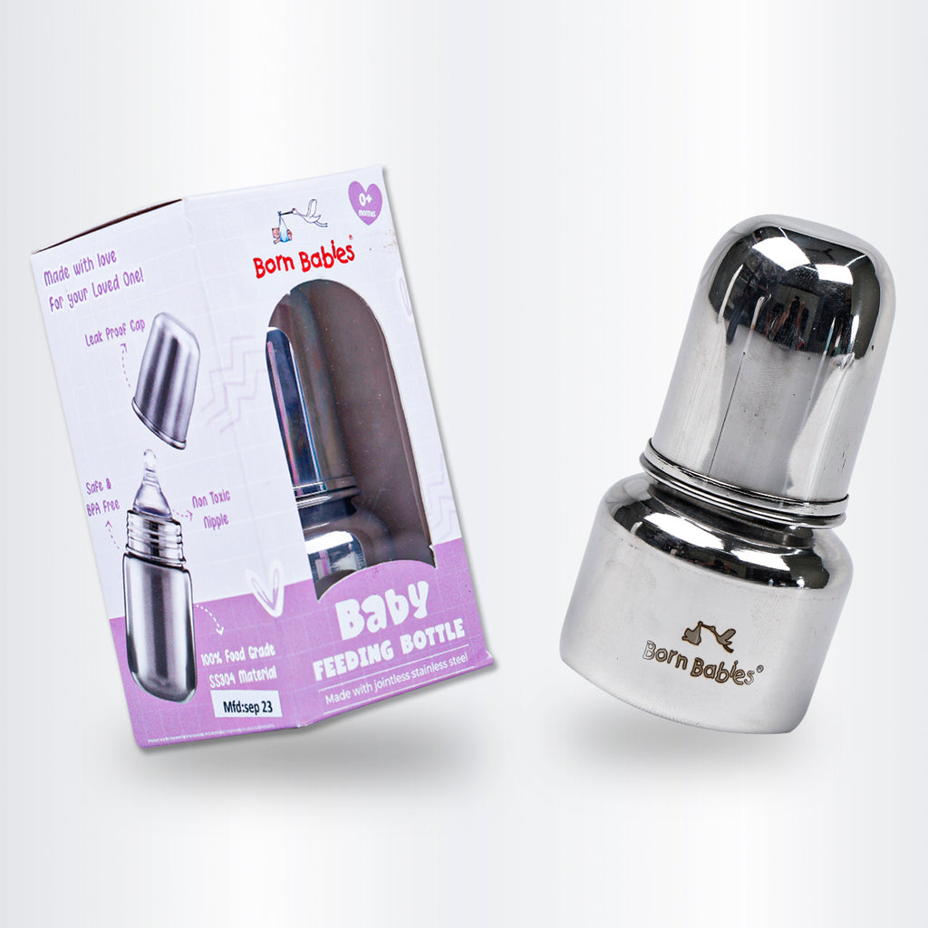 120 ml Born Babies Stainless Steel Feeding Bottle With Anti-Colic Silicone Nipple & Travel Cap