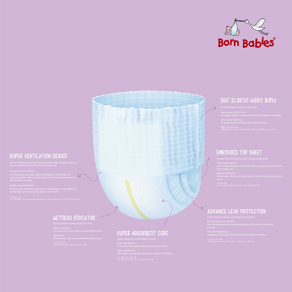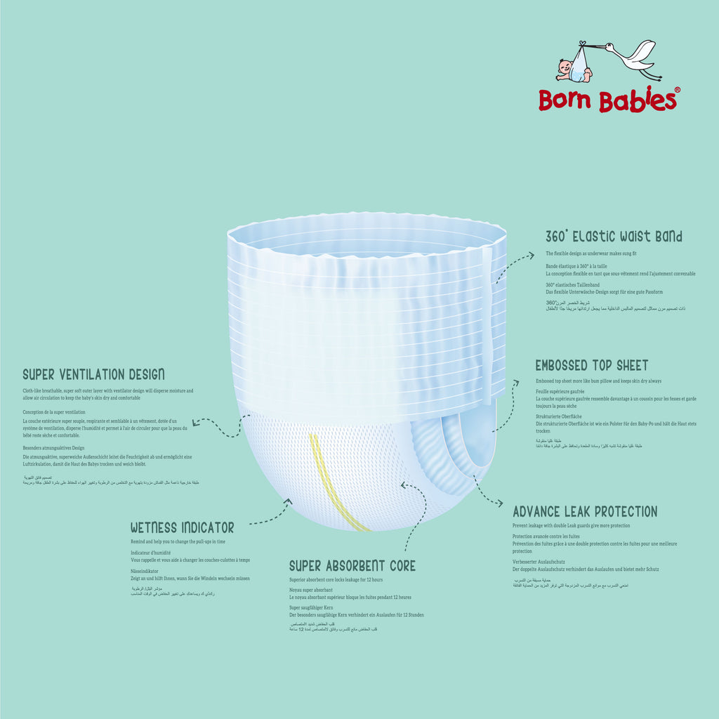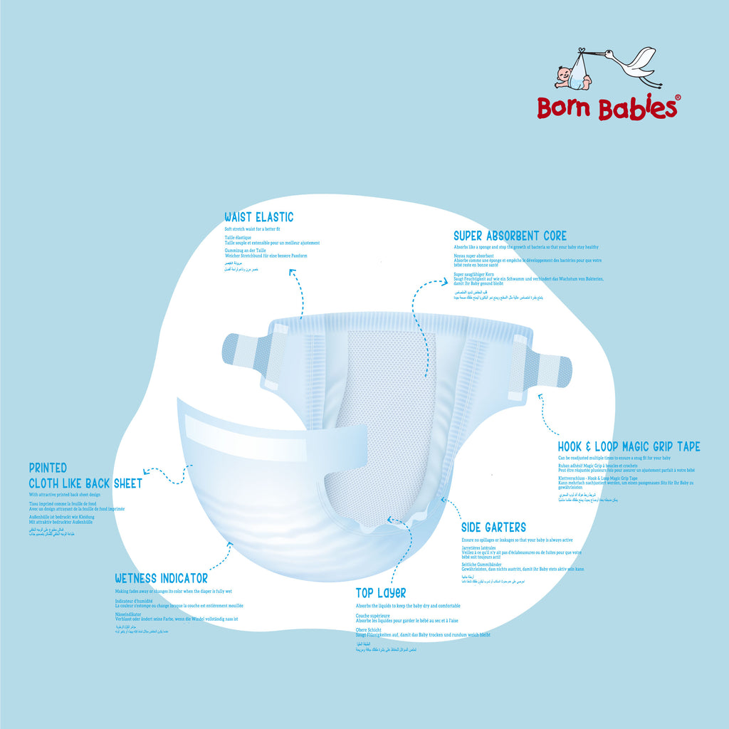 Born Babies diapers are designed with advanced absorbency technology that locks away moisture, keeping your baby dry and comfortable for longer periods.