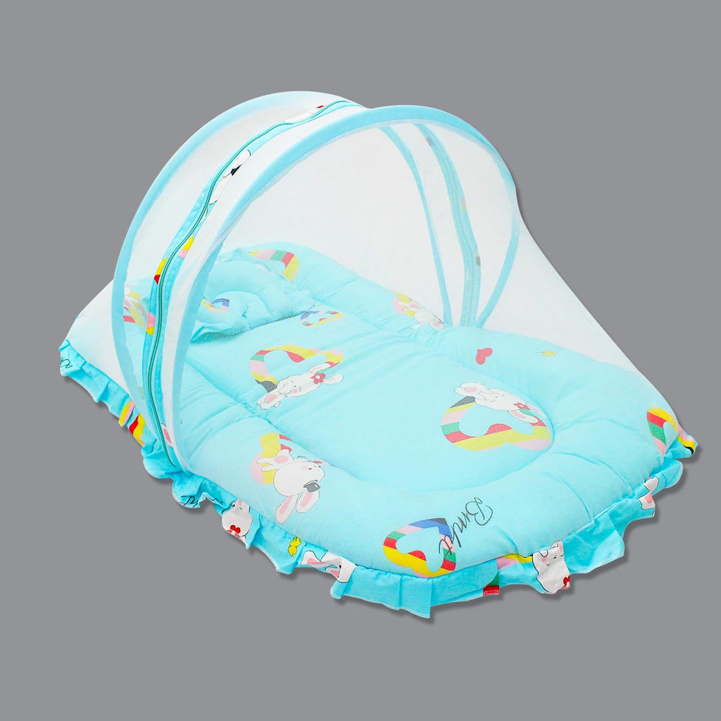 Born Babies Baby Cotton Printed Net Bed With Pillow Light Blue