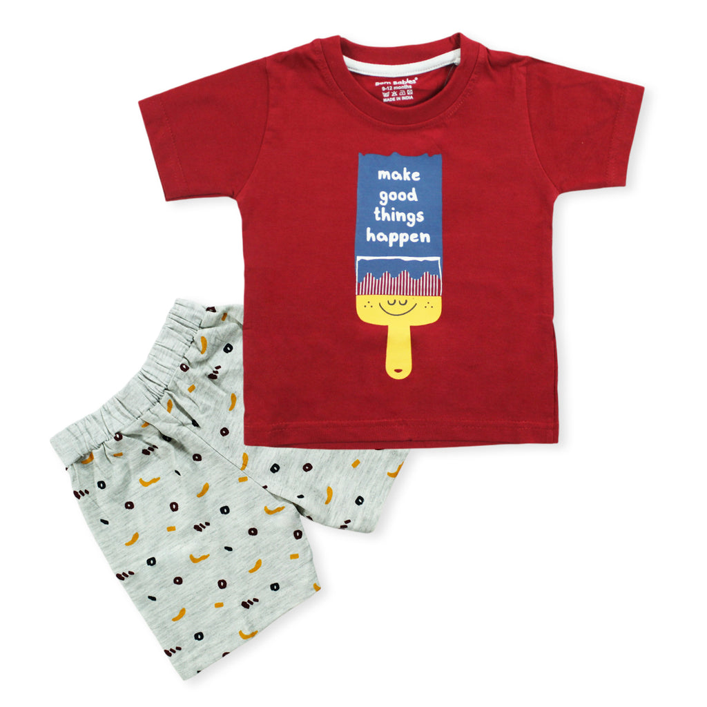 Born Babies Cotton T-Shirts & Shorts Set - (Red & Gray)
