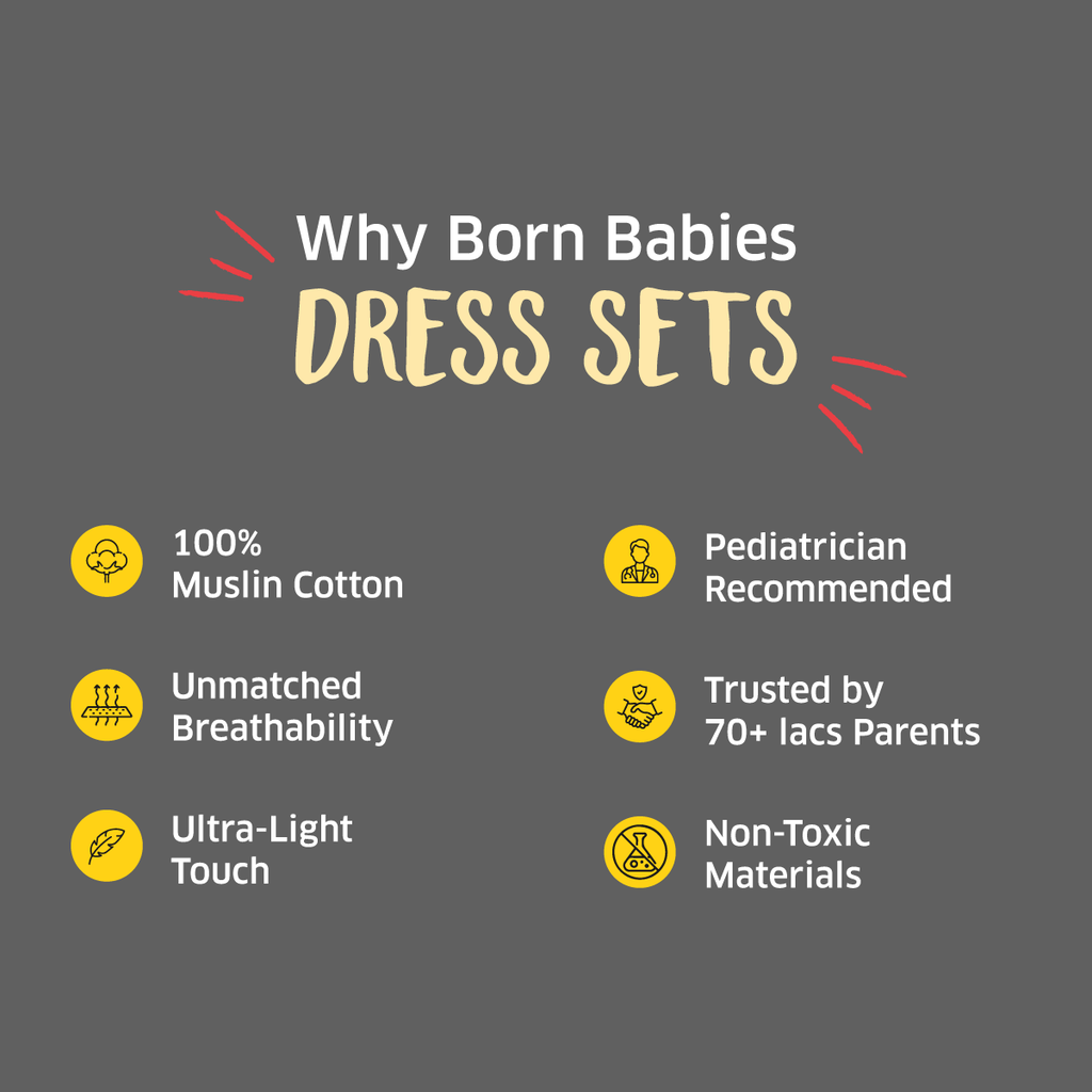 At Born Babies, we take pride in offering a wide range of clothing options designed with your baby's comfort and style in mind. Our Dress Sets are no exception, providing the perfect blend of softness, comfort, and adorable style for your precious newborns.