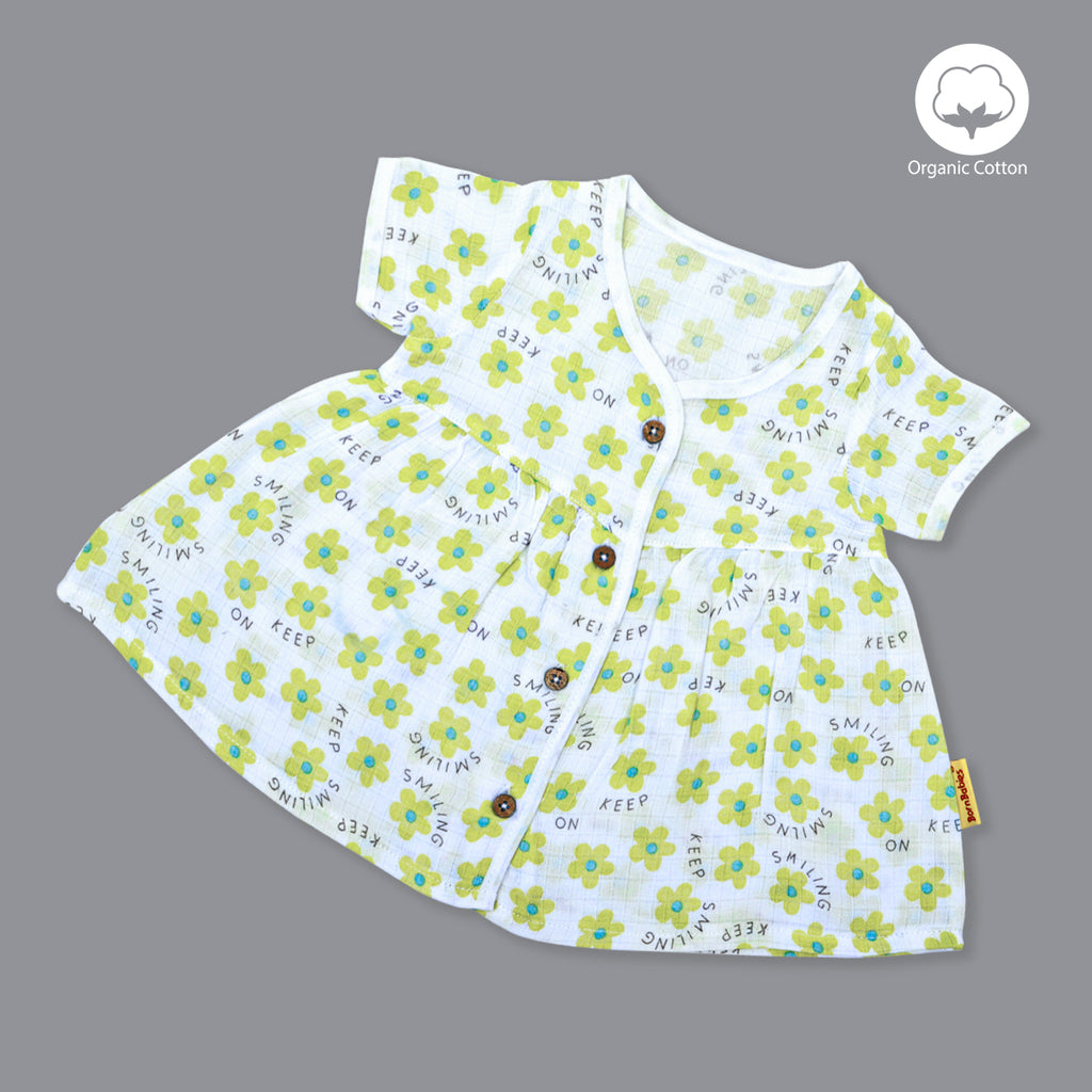 Baby Girl Organic Muslin cotton HalfSleeve Printed Button Frock - Green