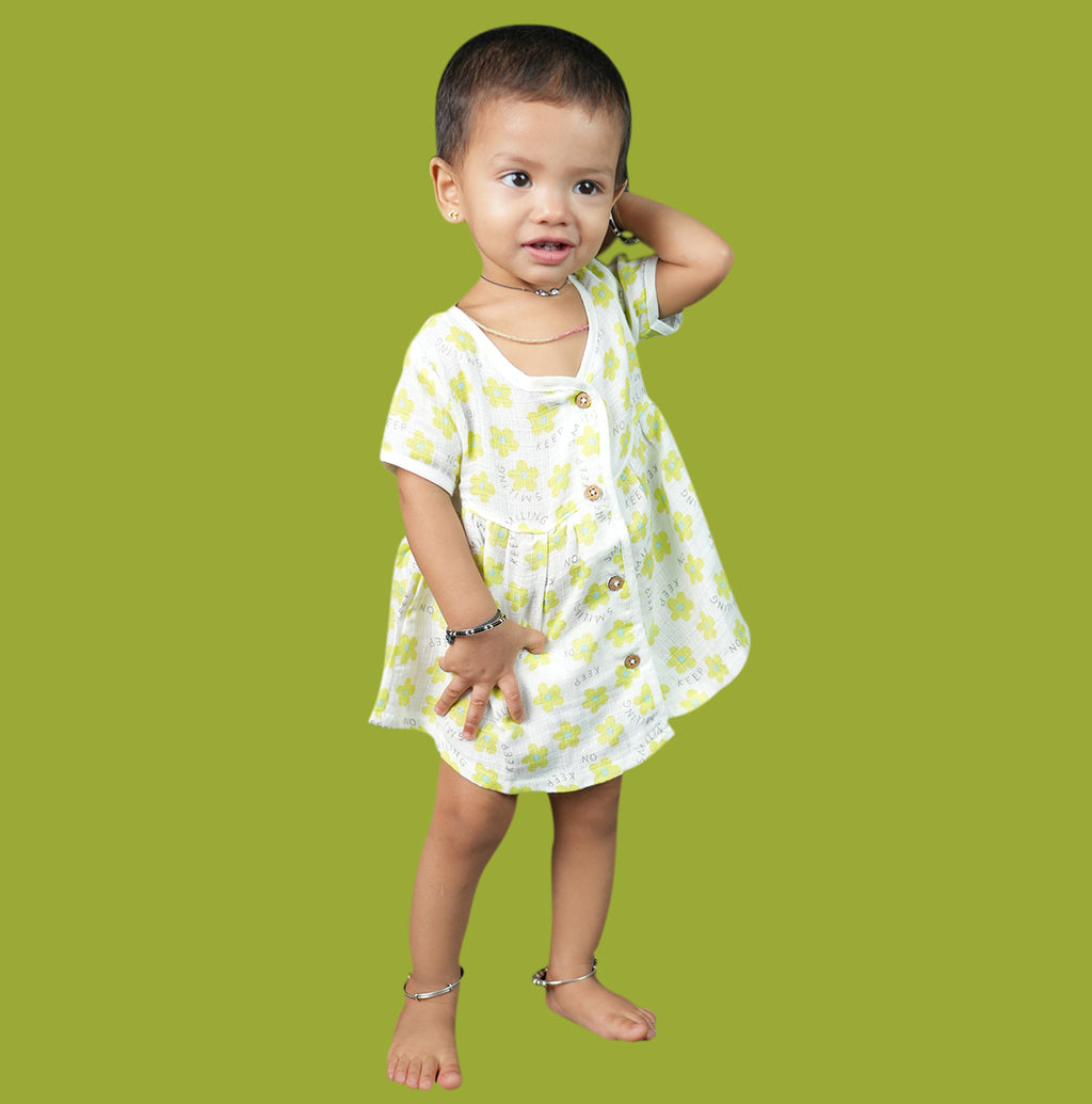 Baby Girl Organic Muslin cotton Printed Button HalfSleeve Frock-Yellow