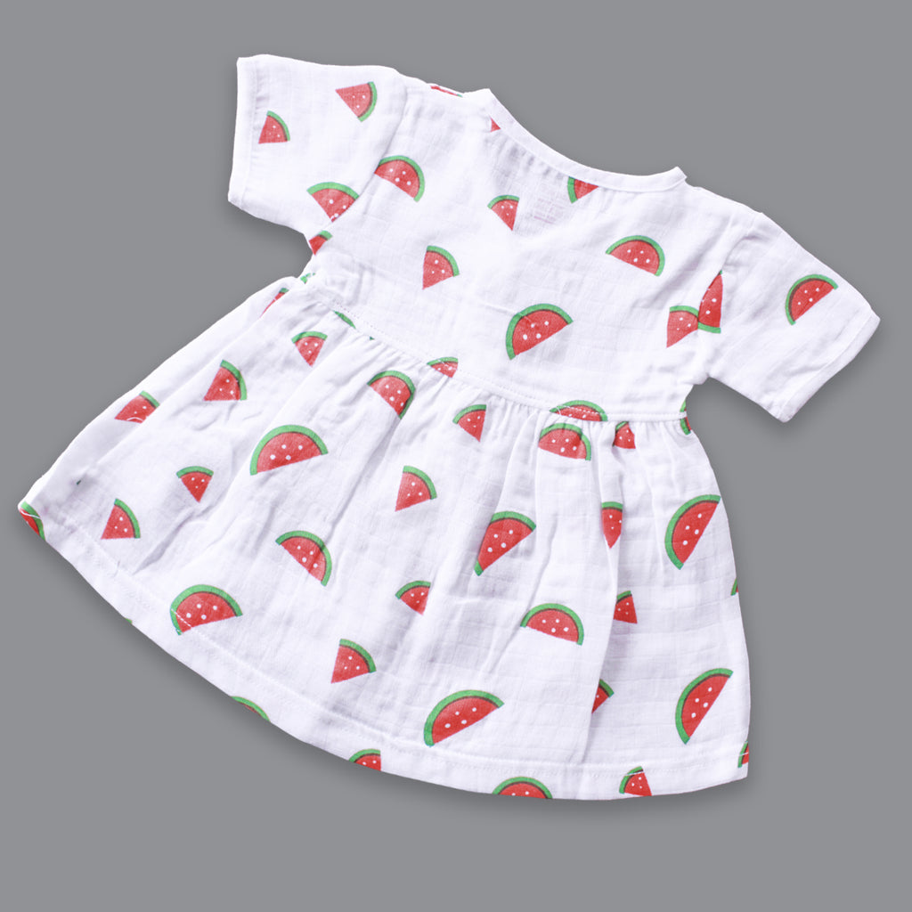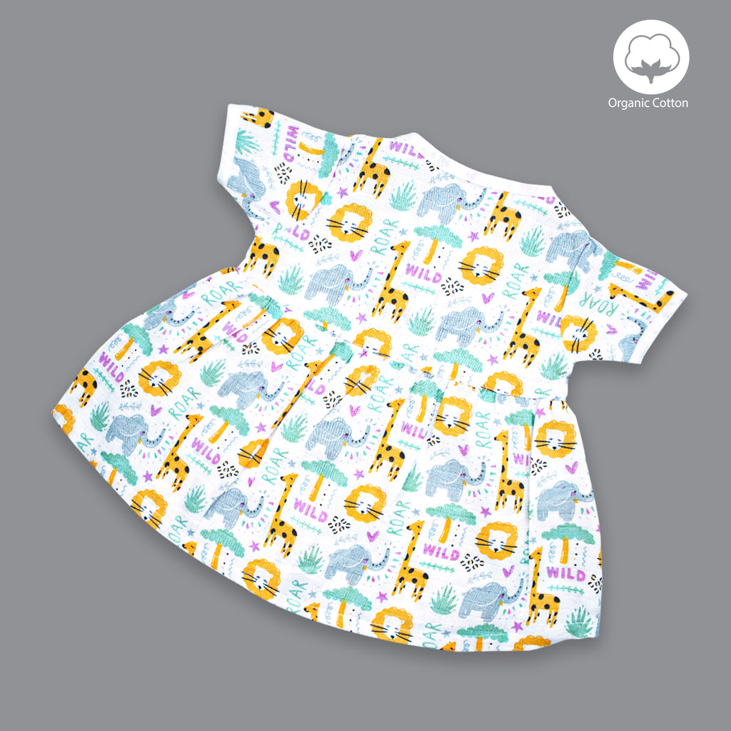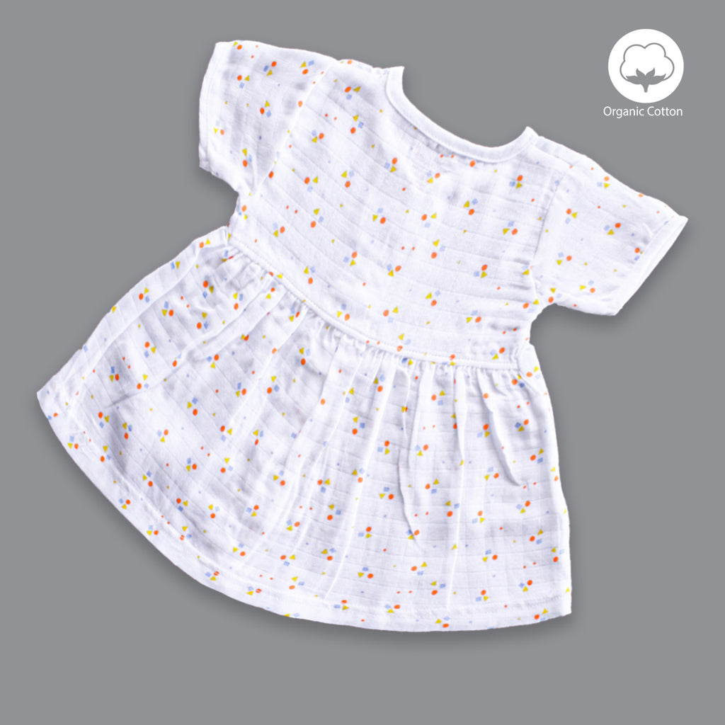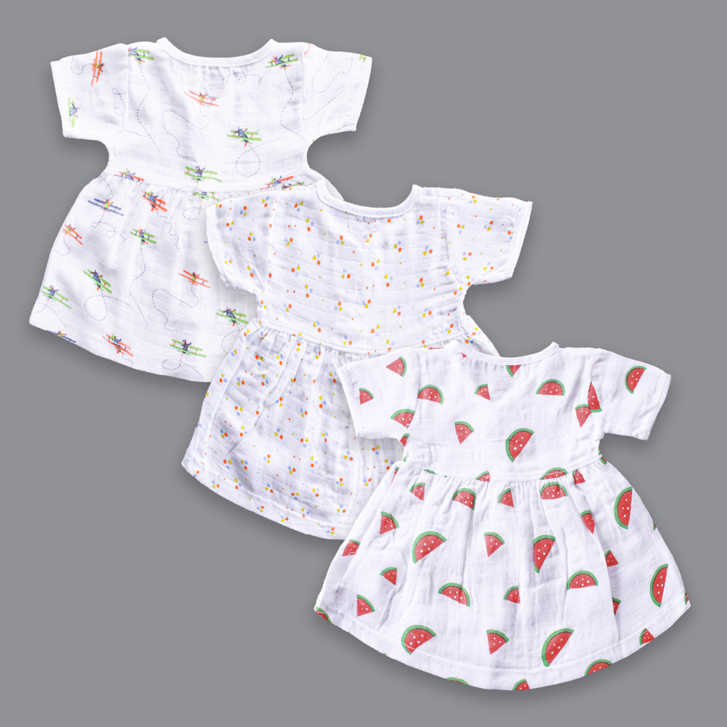 Born Babies Baby Girl Organic Muslin cotton Printed Button HalfSleeve Frock-Multicolor-Pack Of 3