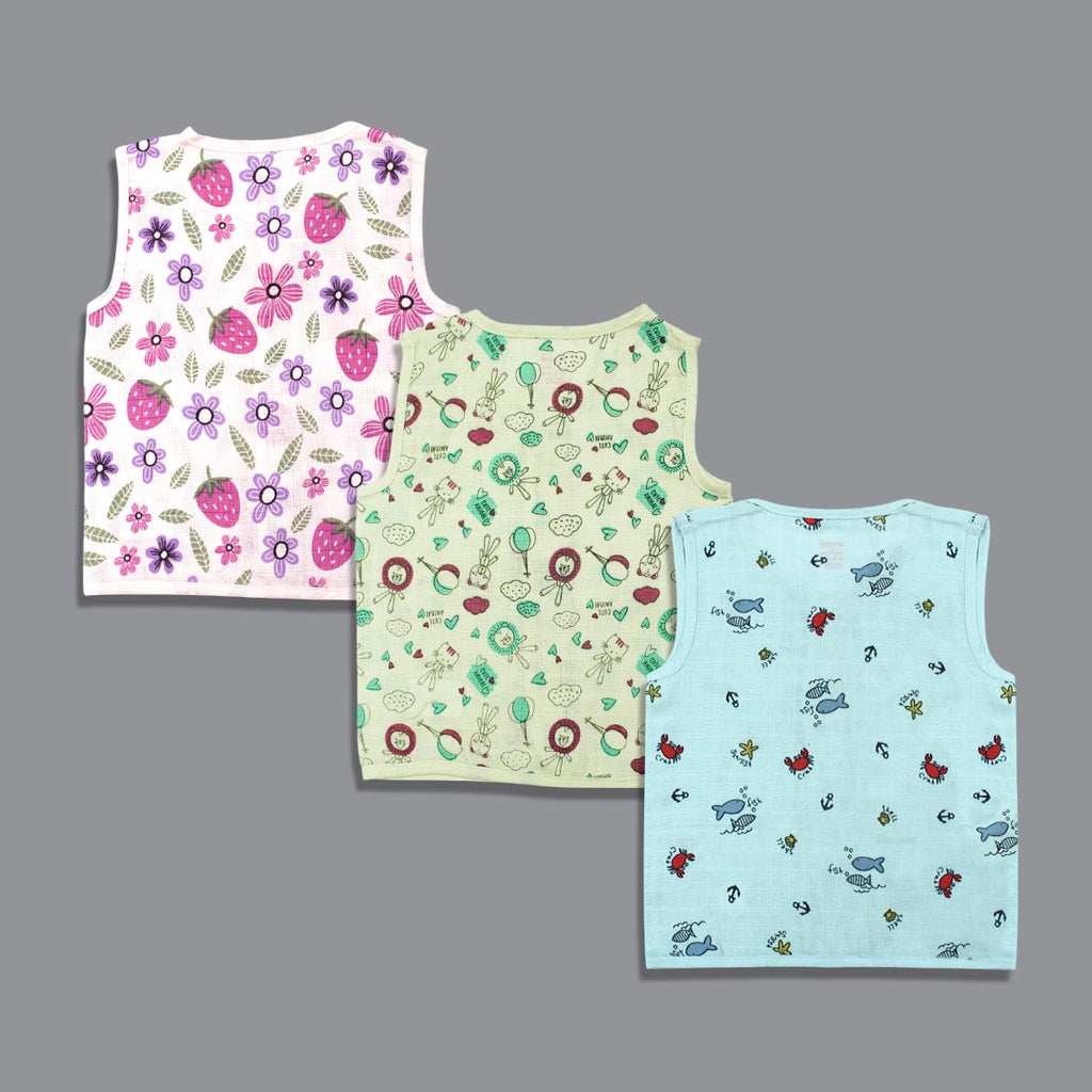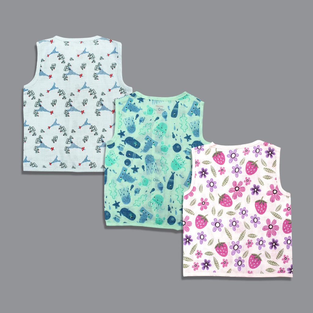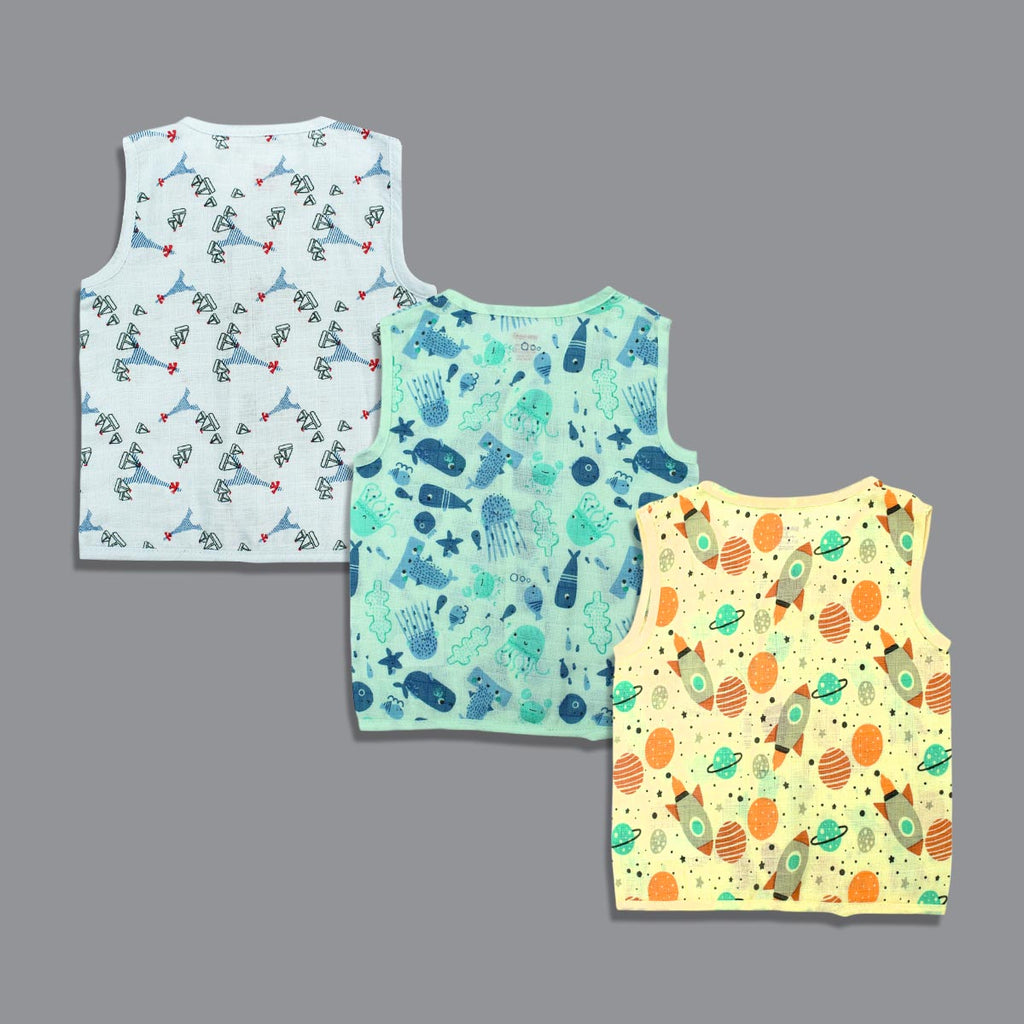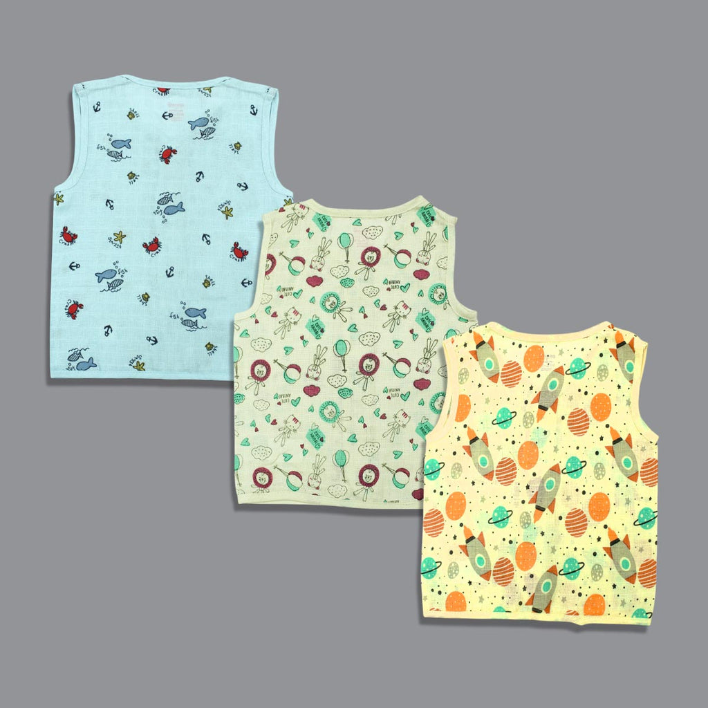 Born Babies Baby Boy & Baby Girl Organic cotton Printed Sleeveless Front Open Button Jabla - (Pack Of 3)