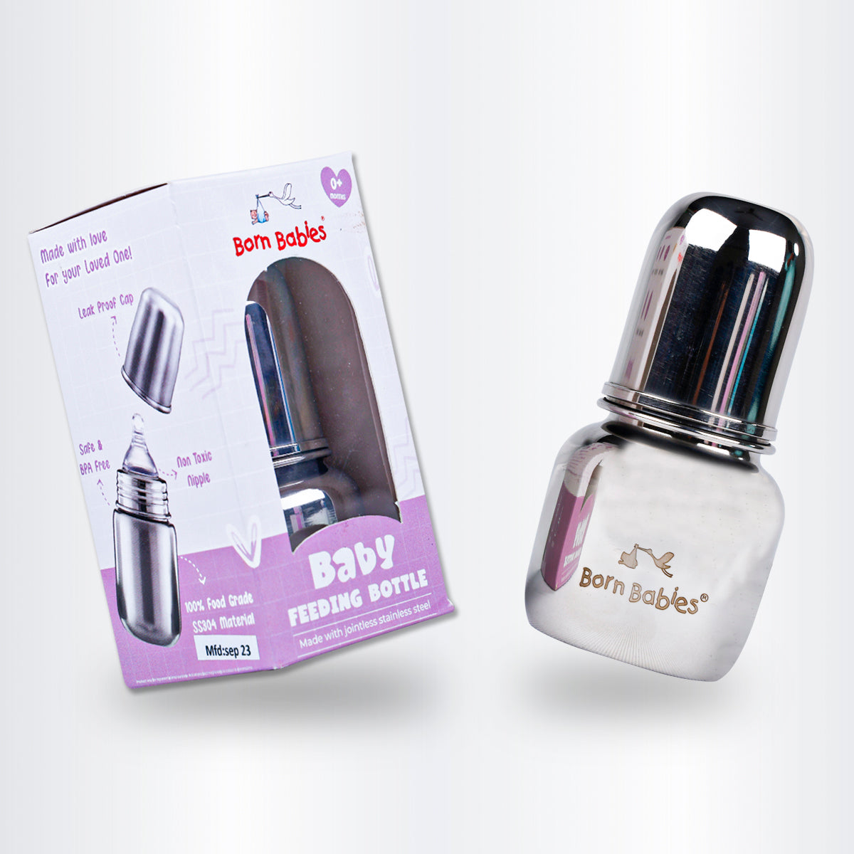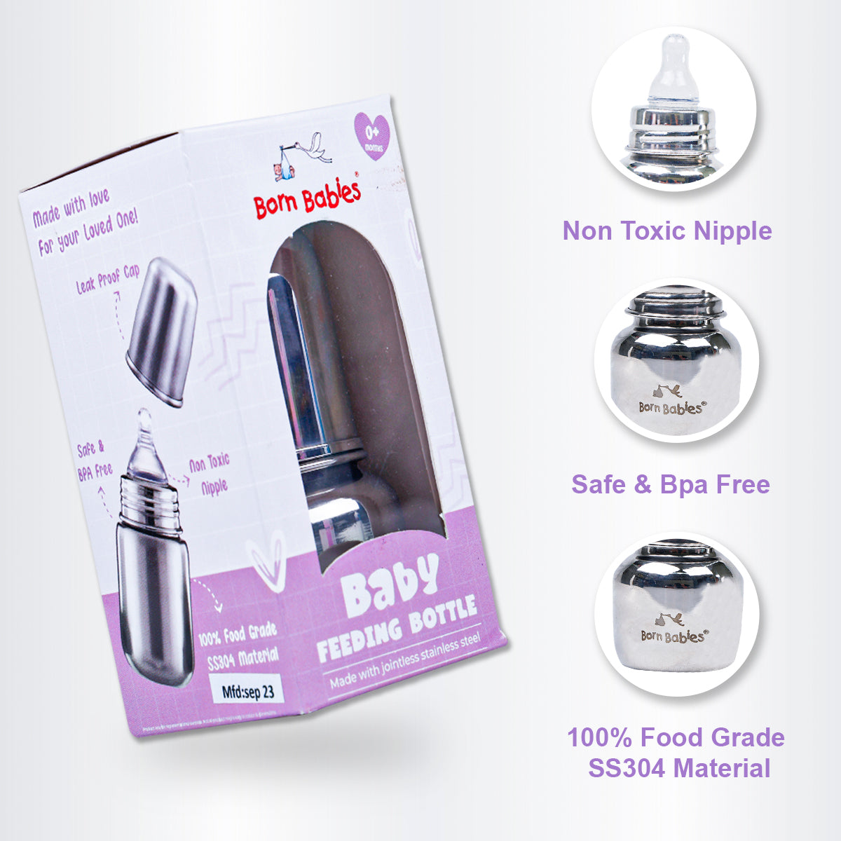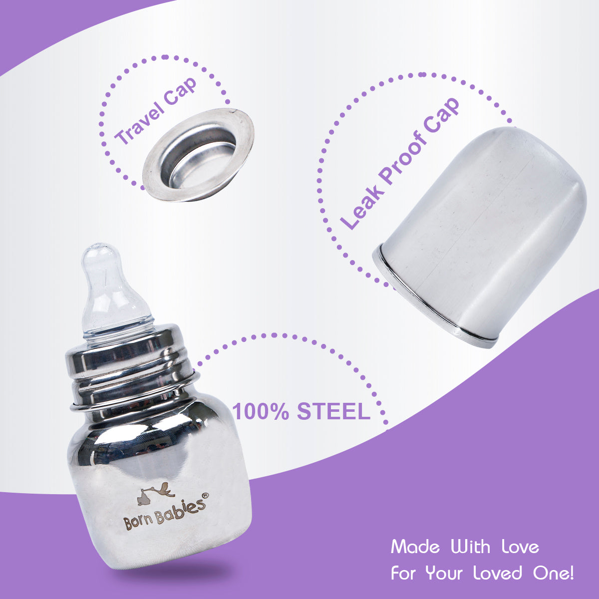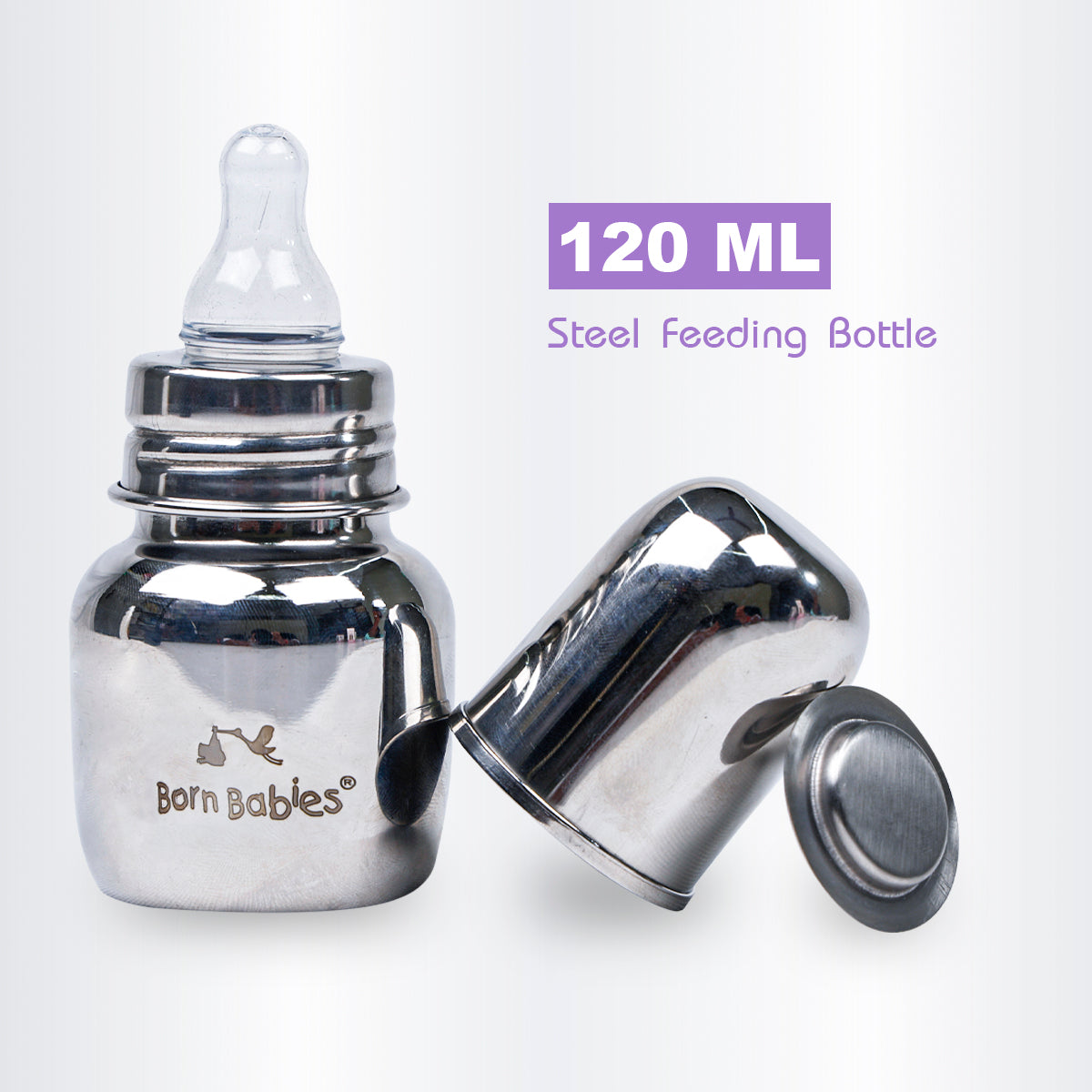 120 ml Born Babies Stainless Steel Feeding Bottle With Anti-Colic Silicone Nipple & Travel Cap